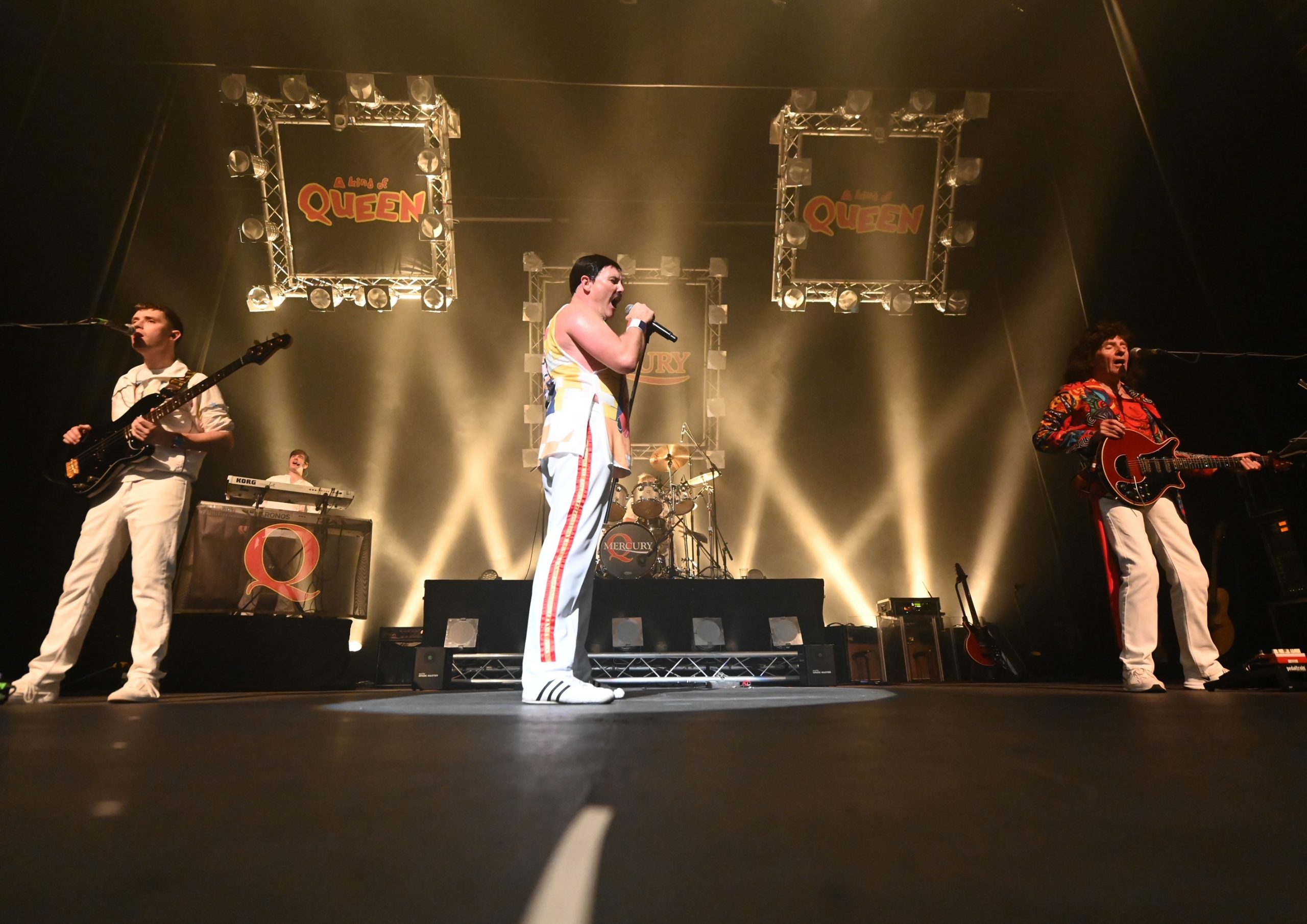 Mercury is committed to the recreation of the Queen live experience. Over the years, Joseph Jackson (Freddie Mercury) and Glen Scrimshaw, who plays Brian May, have invested a lot of money in costumes and equipment to replicate the full look of the rock band. “Glenn has three replicas of the red special guitar and three replicas of the Brian May VOX AC30 amp.” When the tribute started, it was difficult to learn Freddie Mercury’s movements and style of performing, as there was hardly any footage to watch. “It’s a little bit easier now, as you have YouTube where there are so many uploads of concerts from Bootleg to original shows.” Jackson had a VHS recording of Queen live, which he played constantly to learn Freddie’s performance.